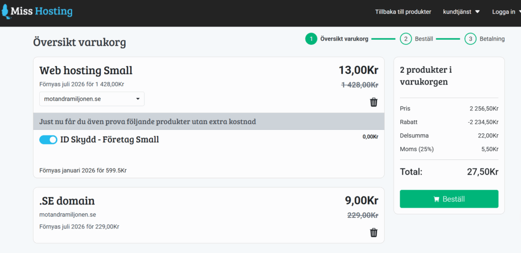 - MissHosting: Här får du tillgång till allt som krävs, lite till och en suverän cashback på 240 kr via Cashbackninja (annonslänk 50 kr) Då första året bara kostar 27,50 så får du ca 210 kr för varje domän du sätter upp.